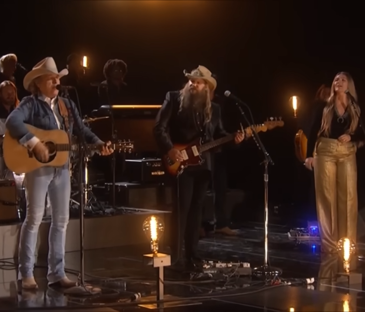 Chris Stapleton, with his gravel-rich voice soaked in soul and sincerity, carries the weight of the song’s sorrow like a man who’s lived it. Beside him, Morgane Stapleton adds a harmony so delicate and mournful, it feels like the whisper of an angel watching from above. Then there’s Dwight Yoakam—a master of the old-school Bakersfield sound—who brings his own layer of weathered wisdom and emotional gravitas to the stage. Together, they don’t just sing the song—they honor it.