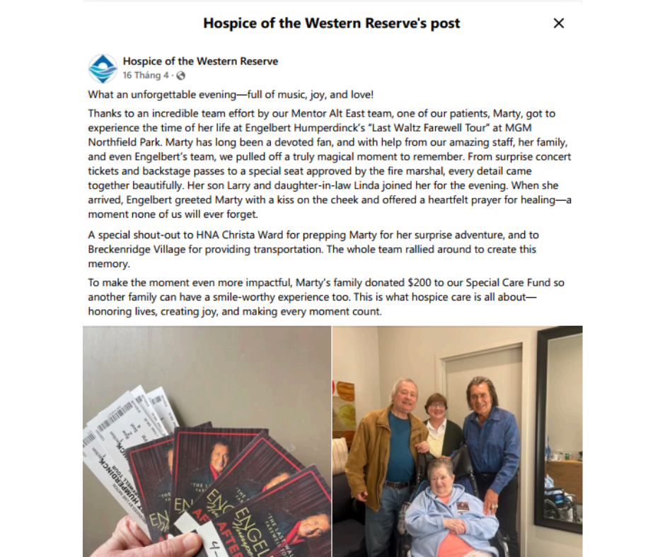 Thanks to a collaborative effort from the Mentor Alt East team and generous supporters, hospice patient Marty recently experienced a night she’ll never forget—attending Engelbert Humperdinck’s “Last Waltz Farewell Tour” at MGM Northfield Park.