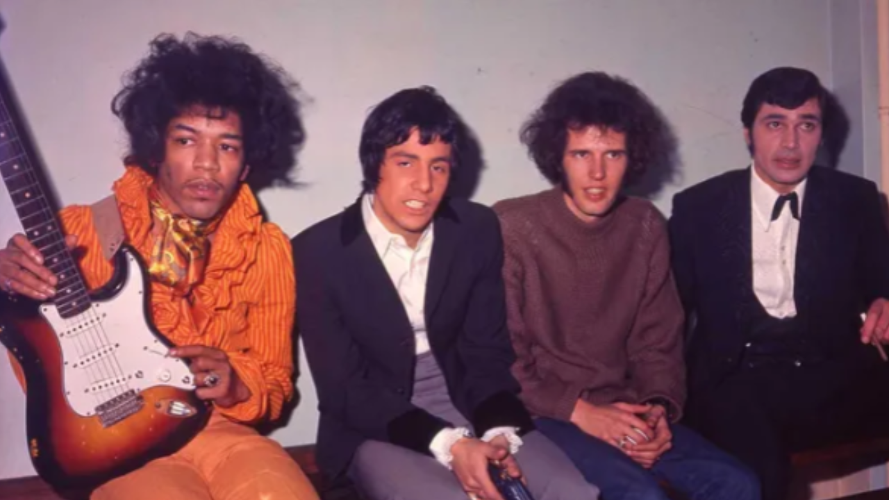 Jimi Hendrix backstage at the opening night of the Walker Brothers UK Tour at Finsbury Park Astoria on 31 March 1967. Along are Cat Stevens (holding gun) and Engelbert Humperdinck (far right), seated either side of Gary Leeds from The Walker Brothers (Image credit: Pictorial Press Ltd / Alamy Stock Photo)