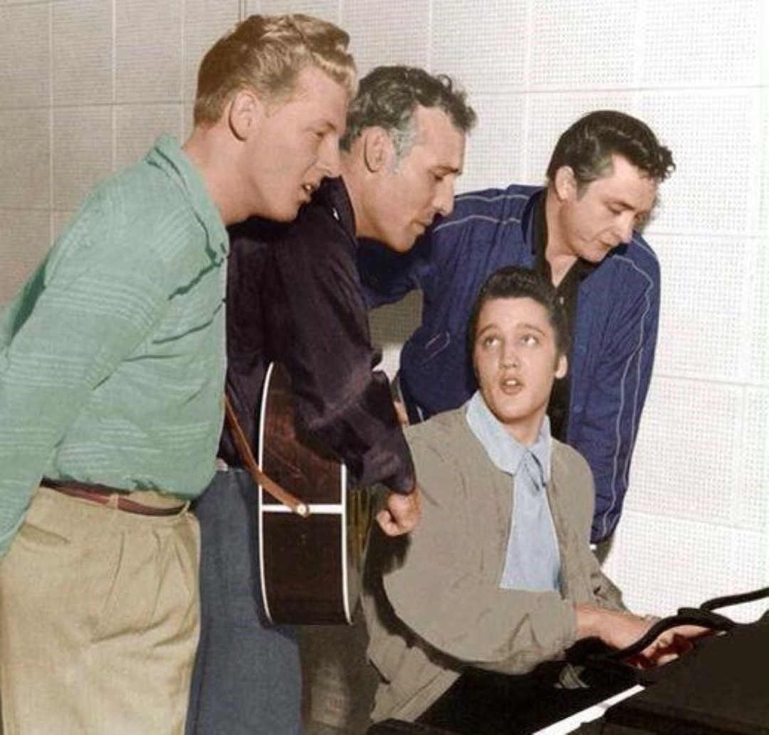 Elvis Presley, barely 20 years old, was the wild one — all twitching hips and untamed energy. Johnny Cash, the quiet man in black, carried a voice as deep and steady as the soil itself. Carl Perkins, a sharecropper’s son from Tennessee, brought the sharp-edged rhythm of a guitar that could make even the most restrained audience stomp their feet.